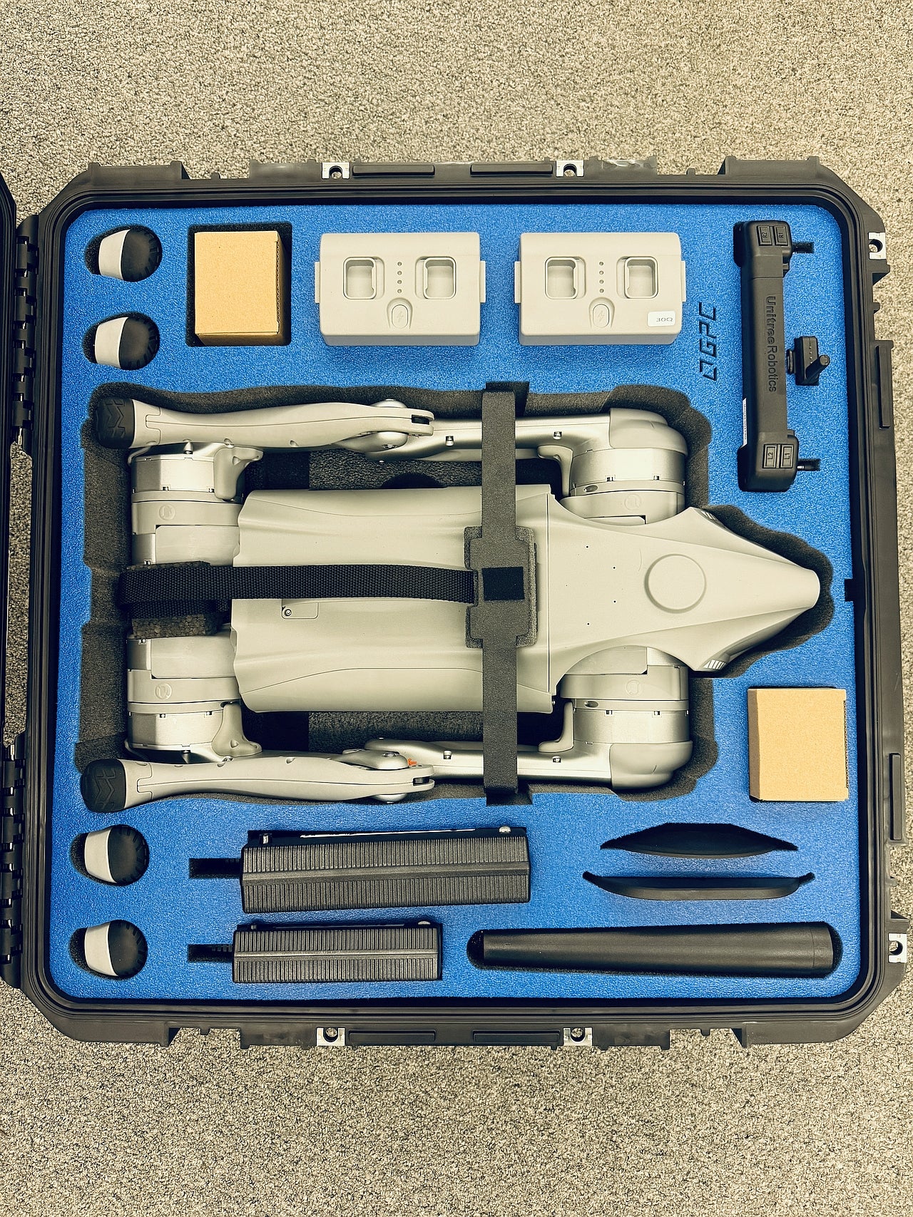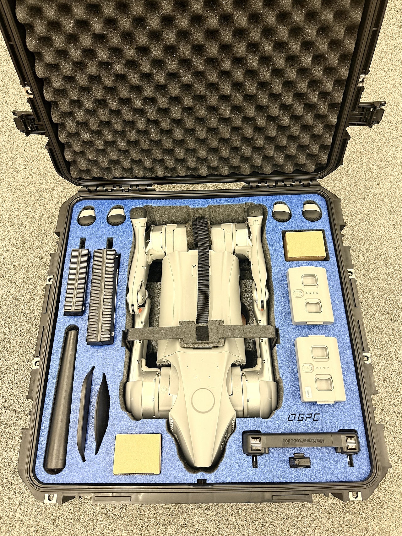 The GPC Hardcase for the Unitree Go 2 Air or Pro is thoughtfully designed to accommodate both the robot unit and its essential accessories, including remote controllers, charging equipment, and additional tools. Featuring a secure leg-lock system, this storage solution ensures that the robot remains firmly in place during storage or transport, minimizing potential damage from shifting or impact. With ample, organized space for accessories, the storage room helps keep everything neatly organized and within easy reach, making it convenient to access and maintain all parts of your Unitree Go 2 Air or Pro setup. Whether for storage at a facility or during transit, this storage unit provides comprehensive protection and easy accessibility, maximizing the lifespan and readiness of your equipment.